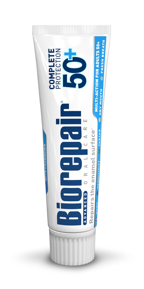 Biorepair Advanced Complete Protection 50+ to specjalistyczna pasta do zębów stworzona z myślą o potrzebach dojrzałej jamy ustnej. Wraz z wiekiem szkliwo staje się bardziej podatne na uszkodzenia, a dziąsła wymagają intensywniejszej pielęgnacji. Dzięki nowoczesnej technologii MicroRepair®, pasta skutecznie wspiera odbudowę szkliwa, redukuje nadwrażliwość oraz dba o zdrowie dziąseł i świeżość oddechu.