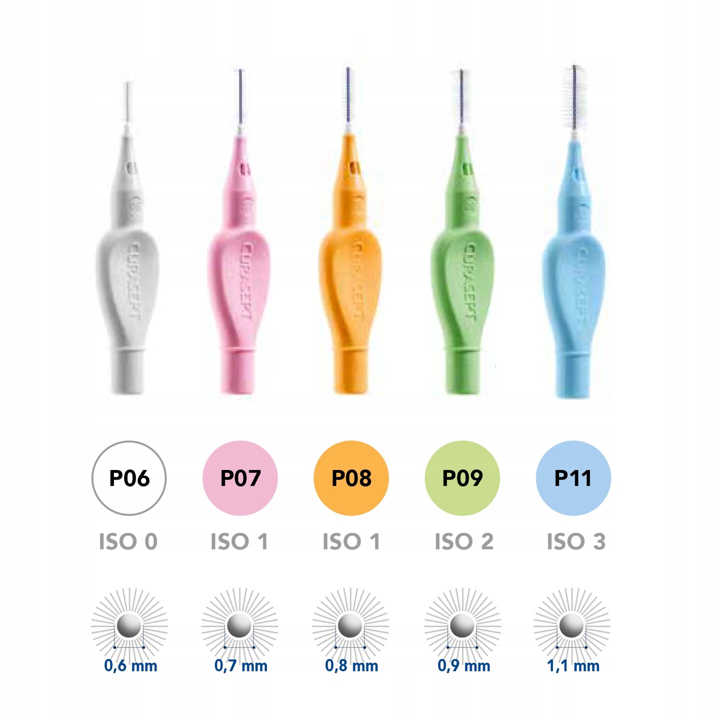 • Rozmiar P08 – średnica 0,8 mm, idealna do większych przestrzeni międzyzębowych