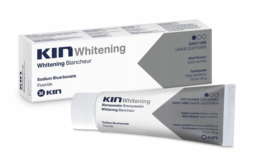 KIN Whitening to pasta wybielająca przeznaczona do codziennego stosowania, opracowana tak, aby skutecznie rozjaśniać zęby bez naruszania szkliwa. Zawiera 15% mikroproszku wodorowęglanu sodu, który delikatnie usuwa przebarwienia, dociera do głębszych warstw szkliwa i jednocześnie wspiera ochronę przed próchnicą, pomagając utrzymać prawidłowe pH śliny.