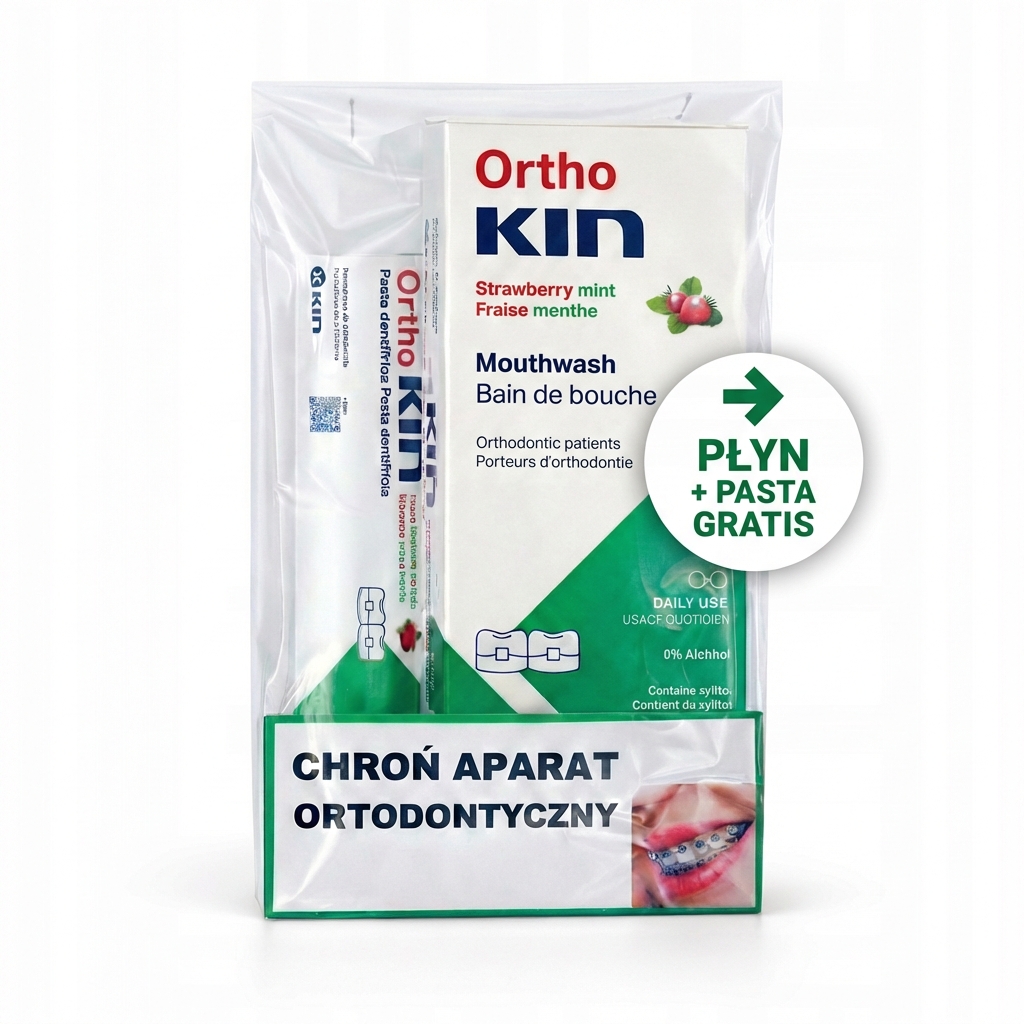 Zestaw OrthoKIN płyn do płukania jamy ustnej + pasta do zębów to specjalistyczne rozwiązanie stworzone z myślą o codziennej higienie jamy ustnej u osób noszących aparat ortodontyczny. Produkty skutecznie chronią zęby, dziąsła oraz elementy aparatu przed próchnicą, stanami zapalnymi i odkładaniem się płytki bakteryjnej.