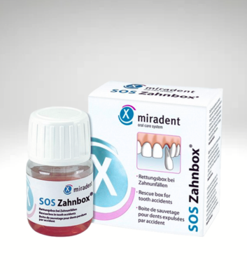 SOS DENTOBOX (Miradent) to specjalistyczny płyn do przechowywania odłamanych fragmentów zęba, przeznaczony do natychmiastowego użycia w przypadku urazu. Przechowywanie zęba w odżywczym płynie tkankowym pozwala utrzymać żywe komórki nawet do 48 godzin, co znacząco zwiększa szanse na skuteczną replantację lub odbudowę zęba.