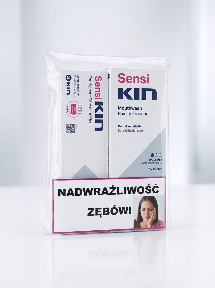Płyn do płukania jamy ustnej SensiKIN wchodzi w skład kompleksowej serii do szybkiego znoszenia nadwrażliwości zębów i przeczulicy zębiny. Zawarte w płynie składniki aktywne dzięki podwójnemu mechanizmowi działania dają natychmiastową ulgę w odczuwaniu bólu. poprzez zamknięcie kanalików zębinowych oraz blokowaniu przesyłania impulsów nerwowych.